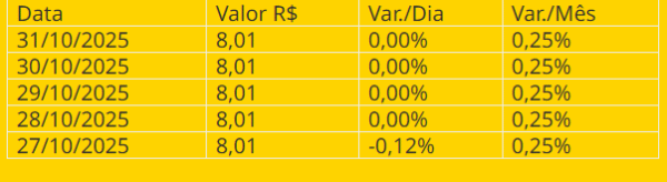 | 31/10/2025 | 8,08 | 0,00% | -0,86% |