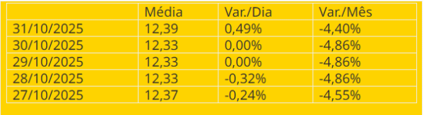 | Data | Valor R$ | Var./Dia | Var./Mês |
