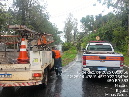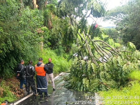 A Defesa Civil de Itajubá realizou atendimentos emergenciais após a queda de árvores que provocaram danos à rede elétrica e a uma residência em diferentes pontos da cidade. Segundo Adílson José, coordenador da Defesa Civil, uma árvore foi retirada no bairro Eldorado, onde um poste precisará ser substituído devido aos danos estruturais.