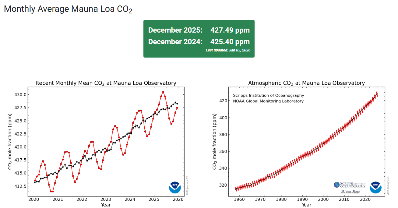 De acordo com o relatório do Copernicus (2026), os últimos três anos (2023–2025) foram excepcionalmente quentes por duas razões principais: (1) acúmulo de gases de efeito estufa na atmosfera, devido às emissões contínuas e a menor absorção de dióxido de carbono por sumidouros naturais e (2) temperaturas da superfície do mar excepcionalmente elevadas em grande parte dos oceanos, associadas à variabilidade natural oceânica e amplificadas pelas mudanças climáticas. Com relação ao (1), a Figura 3 mostra a série temporal de dados de dióxido de carbono medidos numa ilha no meio do oceano Pacífico. O aumento da concentração de dióxido de carbono é crescente mês a mês. Se o leitor tiver curiosidade, pode visitar mensalmente o sítio https://gml.noaa.gov/ccgg/trends/ e comparar os valores mensais das medidas.