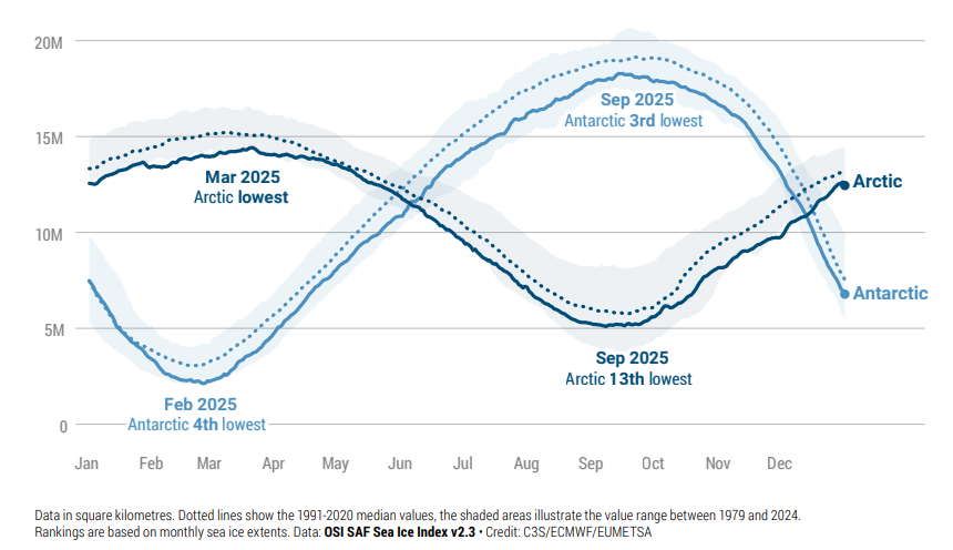Figura 4 Ciclo anual da extensão de gelo marinho em 2025 comparado com a média 1991-2020 na Antártica (azul claro) e Ártico (azul escuro). Fonte: Copernicus (2026).