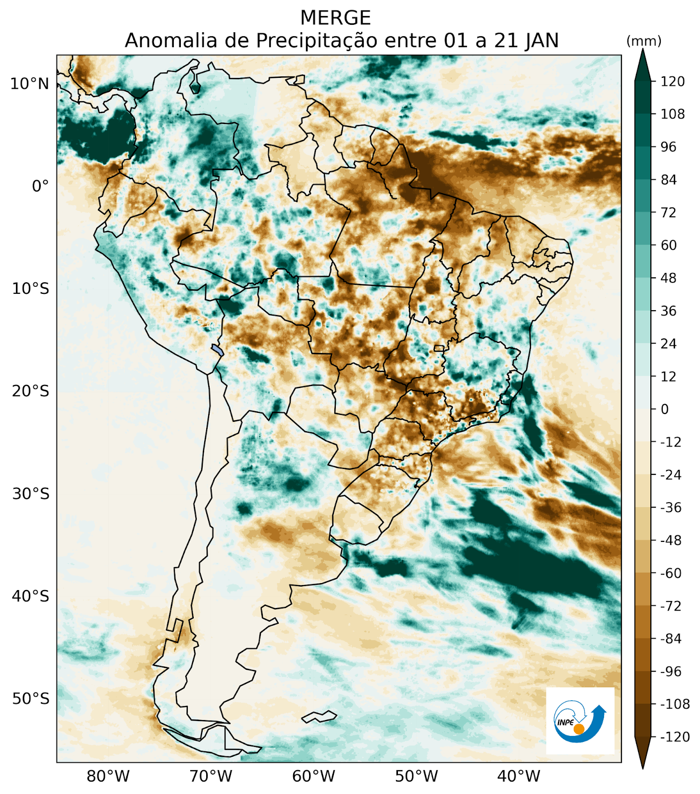 No Brasil, as chuvas ocorridas em janeiro ainda estão abaixo do valor médio esperado no período. Isso é mostrado através da Figura 5, que se trata da diferença entre o que choveu de 1 a 20 de janeiro e a climatologia do período. Nesse panorama, o sul de Minas Gerais também encontra-se com menos precipitação do que o esperado. Essa situação do país tem afetado o nível dos reservatórios.