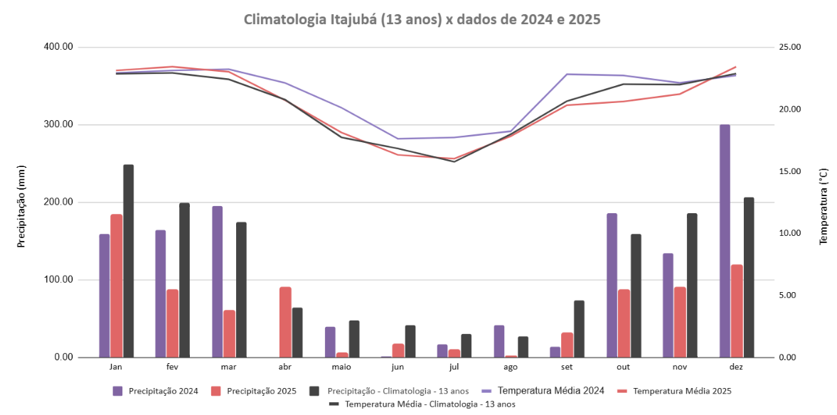 As médias mensais da temperatura do ar no ano de 2025 em Itajubá estiveram muito próximas do valor climatológico, embora entre janeiro e março e dezembro tenham excedido o valor médio (Figura 6). Já a precipitação foi abaixo do acumulado esperado, exceto no mês de abril de 2025, que excedeu o valor climatológico. No ano de 2025, choveu 778 mm, o que é 53% do valor total esperado (Figura 6).