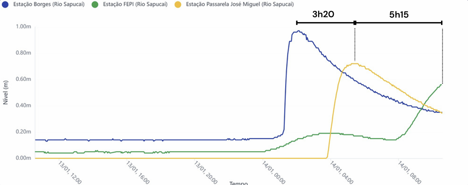 Um exemplo claro foi a tempestade registrada em Campos do Jordão/SP (região de nascente) no dia 13/01/2026, por volta das 17h30. A água que viajou pelos rios chegou em Itajubá na madrugada seguinte: o primeiro pico de nível foi detectado na Estação Borges (Bairro dos Borges) às 02h05 do dia 14/01, atingindo a marca de 0,97m. Isso representa um tempo de resposta de aproximadamente 8h30 após a chuva na cabeceira.