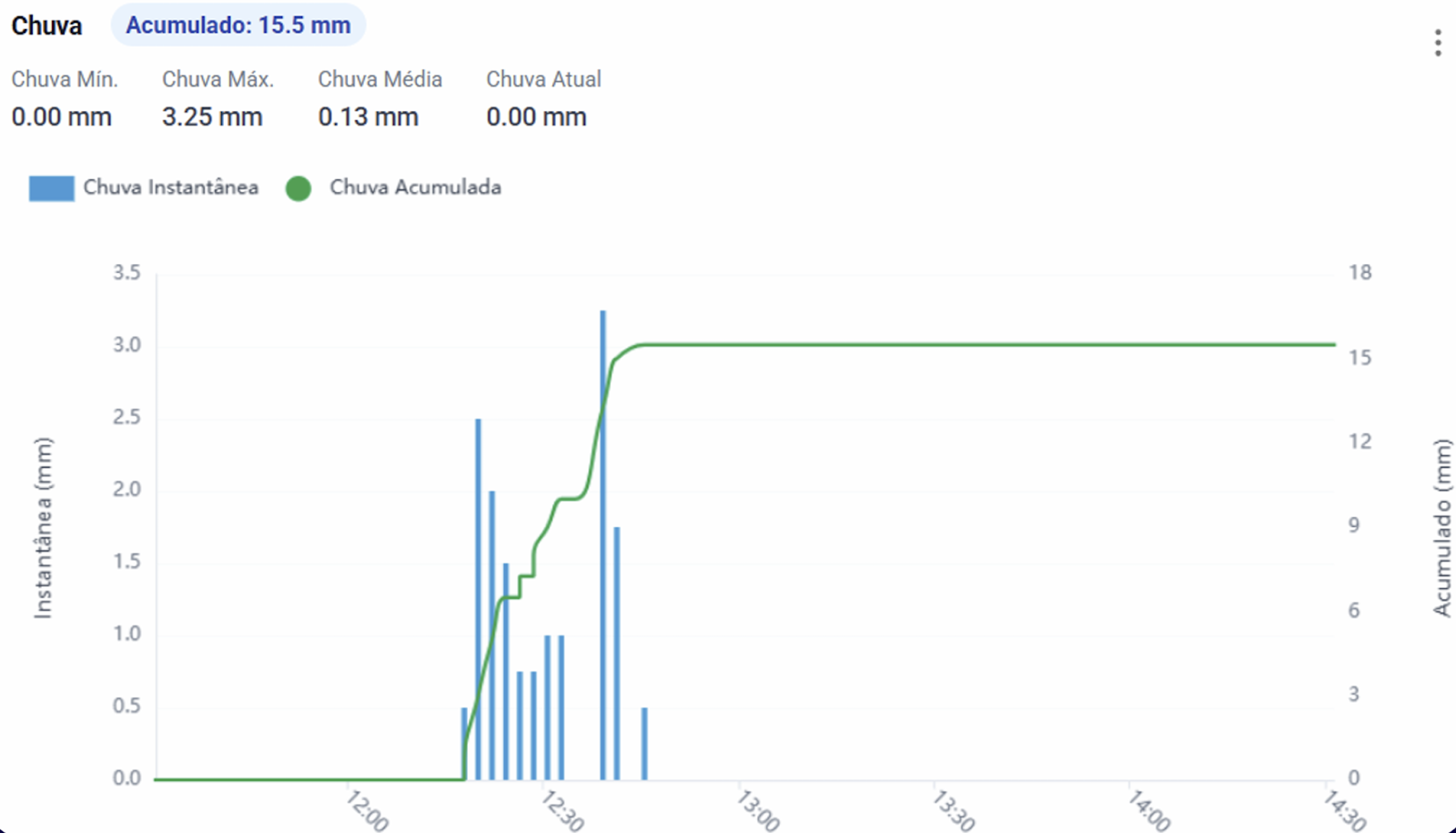 Outro evento que vale o destaque ocorreu no dia 15 de janeiro de 2026, na Rua Augusto de Almeida (Jardim das Colinas). A Estação de monitoramento instalada nesta rua registrou ocorrências de alagamento que chamam a atenção pela rapidez da resposta hidrológica. Pela análise dos dados, nota-se que os acumulados de precipitação não foram extremamente elevados, registrando apenas 15,5 mm no primeiro evento (início da tarde, 12h17 até 12h45), como mostra a Figura 12, e 16,5 mm no segundo evento (final da tarde, 16h39 até 18h34), como mostra a Figura 13. Contudo, esses volumes foram suficientes para causar o alagamento na via, como mostram os gráficos das Figuras 14 e 15.