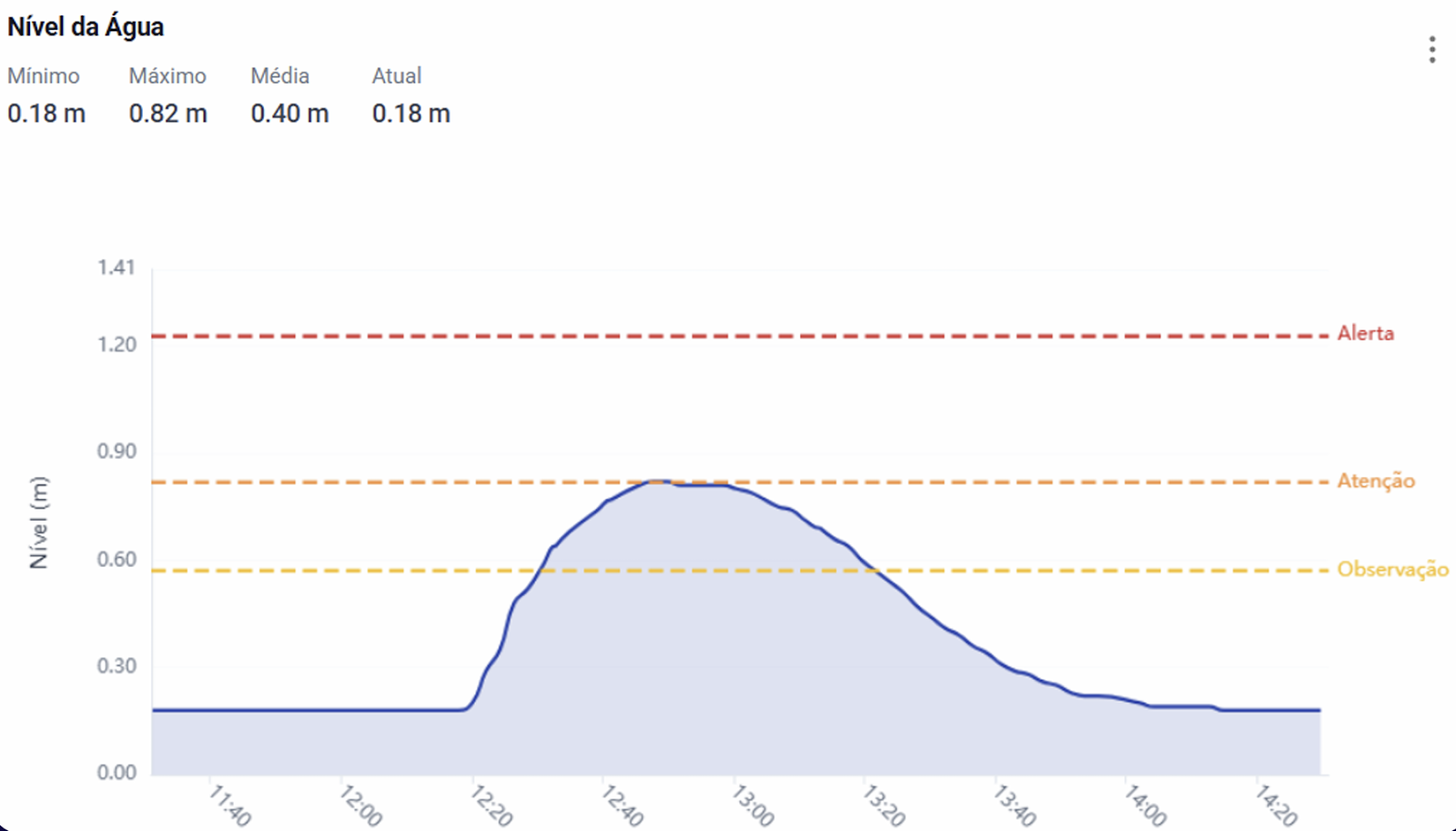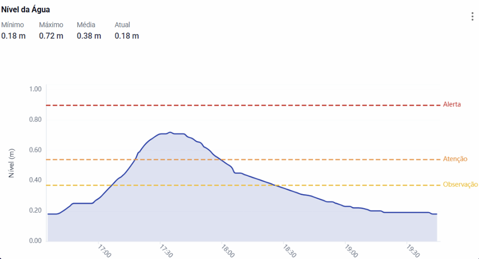 Já no segundo evento, iniciado com precipitação às 16h39, a evolução foi ainda mais crítica quanto ao tempo de reação: o alerta de “Observação” foi emitido às 17h16 e, apenas cinco minutos depois, às 17h21, o sistema disparou o nível de “Atenção”, confirmando o alagamento e a necessidade de evitar o trânsito no local.