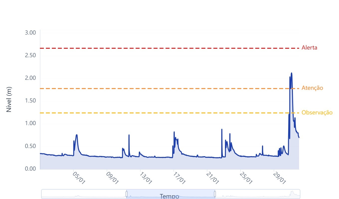 Figura 8 Gráfico de nível do Ribeirão Zé Pereira na Estação localizada na Av. BPS no período de 01.01.2026 a 00h00 a 31.01.2025 às 23h59. Fonte: Software Asthon Tecnologia (2026).