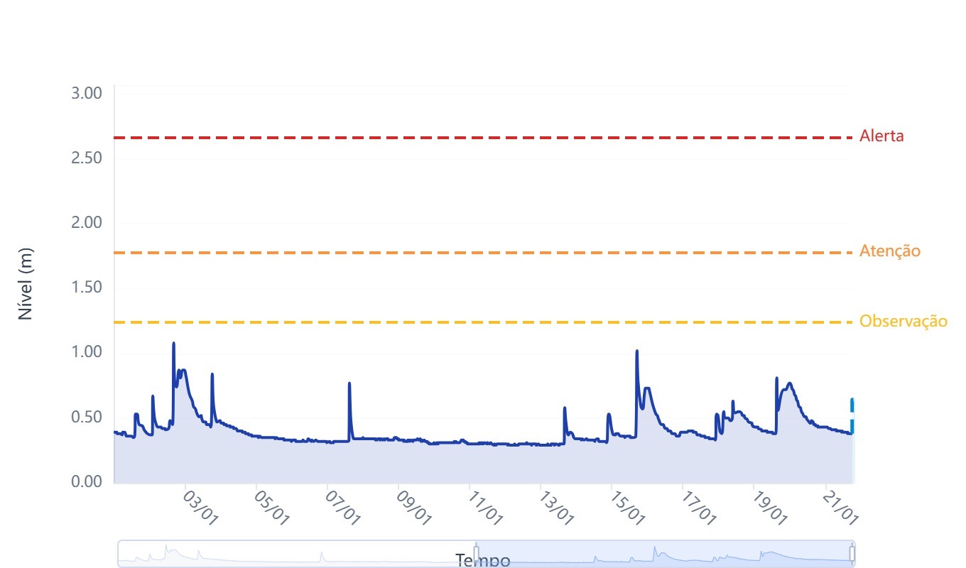 Figura 10 Gráfico de nível do Ribeirão Zé Pereira na Estação localizada na Av. BPS no período de 01.01.2026 a 00h00 a 21.01.2025 às 118h18. Fonte: Software Asthon Tecnologia (2026).
