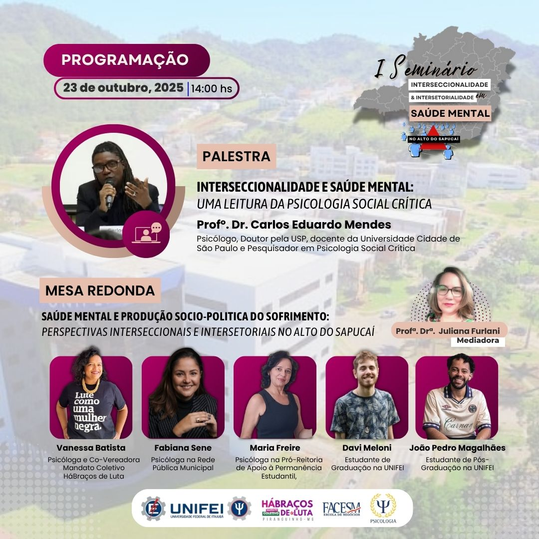 A programação inclui uma palestra com o psicólogo e professor da USP, Dr. Carlos Eduardo Mendes, que abordará o tema Interseccionalidade e Saúde Mental. Em seguida, será realizada uma mesa-redonda com as psicólogas Vanessa Batista, Fabiana Sene, Maria Freire (Unifei), e os representantes estudantis Davi Meloni (graduação) e João Pedro (pós-graduação).