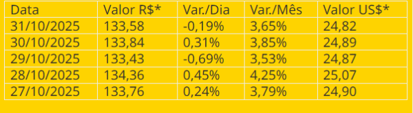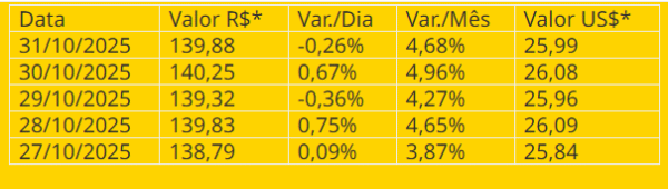 | DATA | VALOR R$/T* | VAR./DIA | VAR./MÊS | VALOR US$/T* |